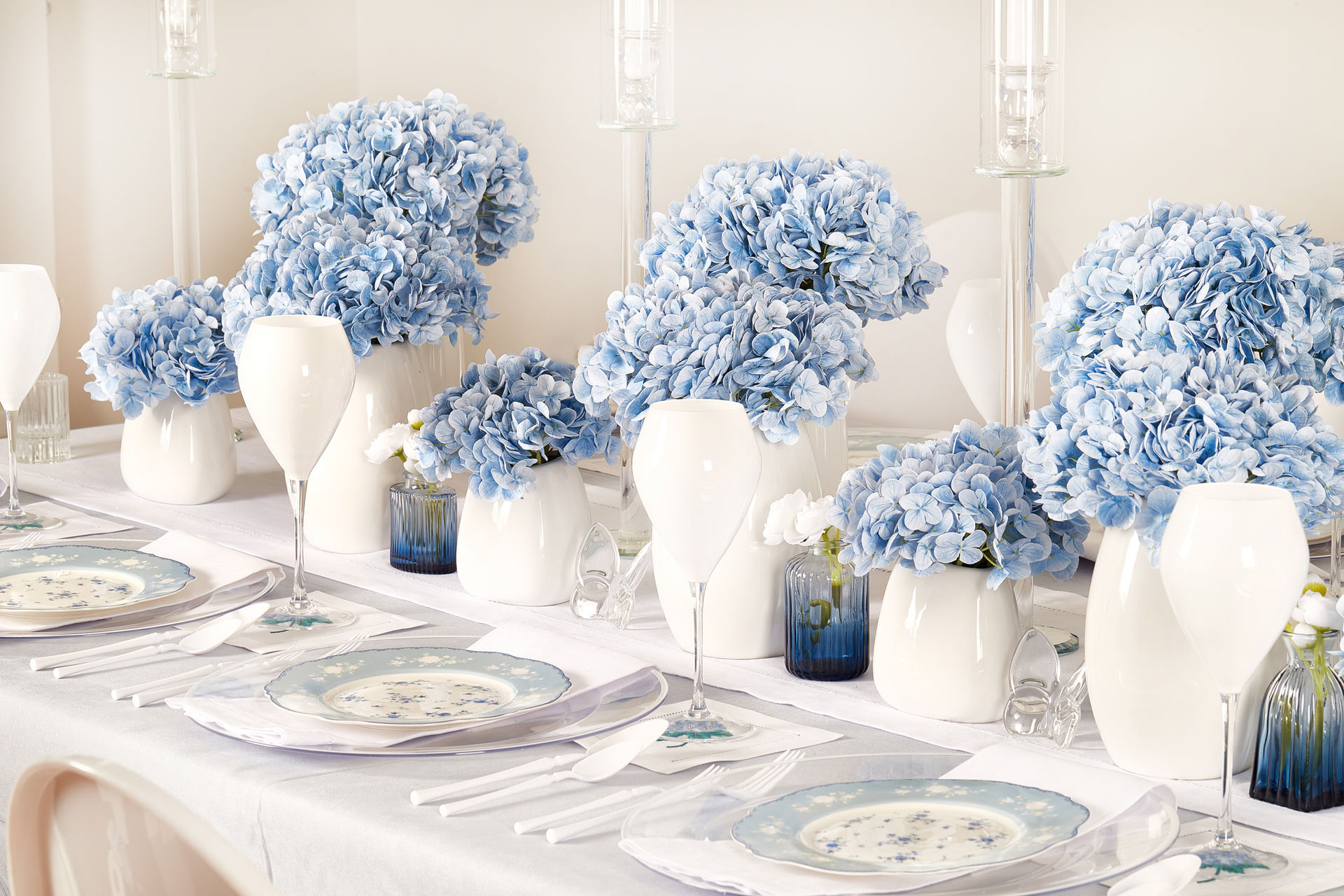 This tablescape is an artful blend of hues and textures. Vivid blue lifelike hydrangeas, delicate butterflies and floral napkins entrance the senses. Delicate fine china dishes are the finishing touch creating a dreamy, elegant escape.