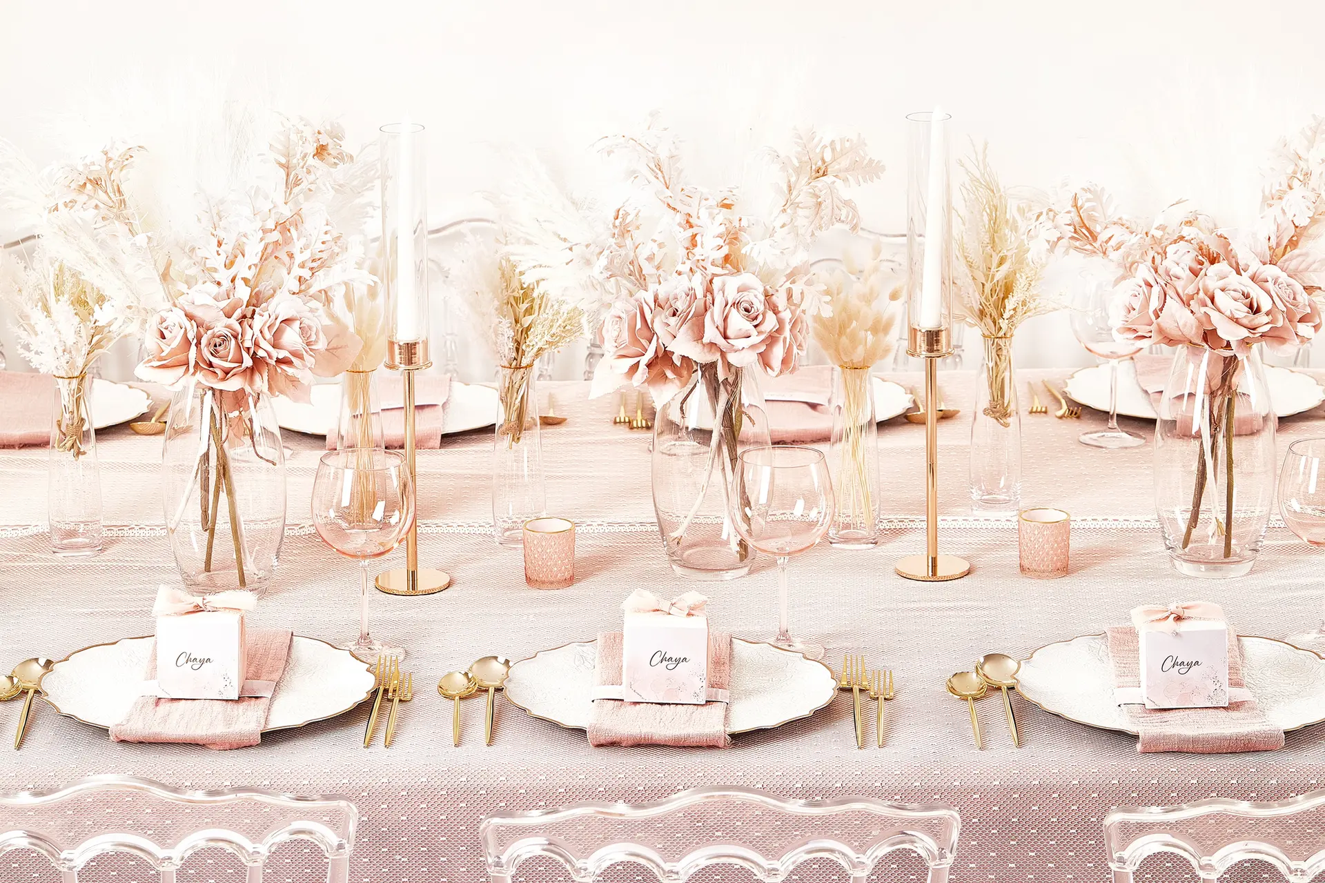 This dainty party is a vision in dusty pink. Delicate hues and classic detailing will transform your table into a haven of artistic pleasure and gracious entertaining. Bring beauty into your home or event space with graceful lace overlays, richly elegant candlesticks, and breezy dried pampas florals—all included in the package and delivered to your door.